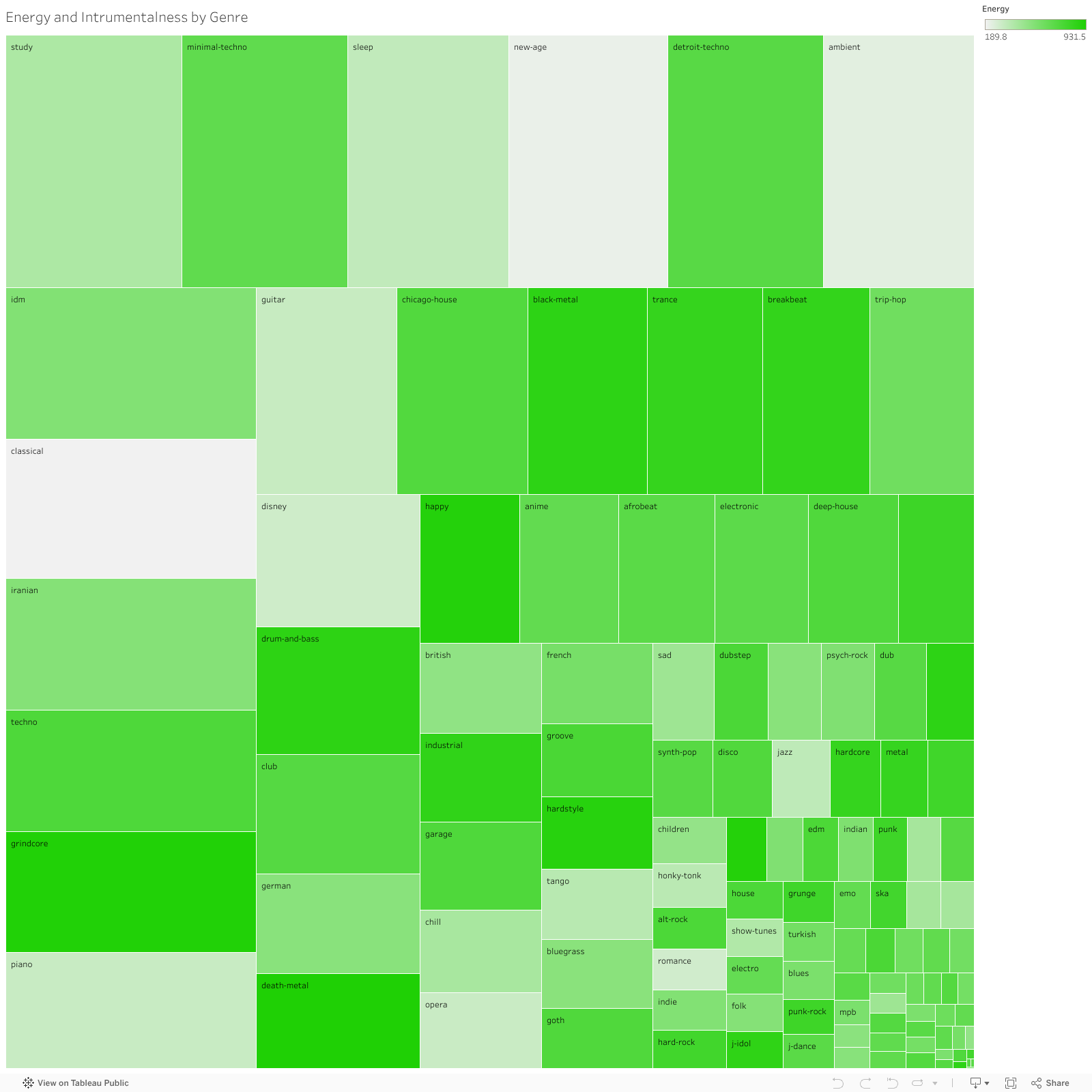This treemap compares every genre by instrumentalness first, then energy. The size of each square is the sum of instrumentalness within the genre, and the color is the sum of energy. I found it interesting to see that there is no obvious correlation between instrumentalness and energy across genres.